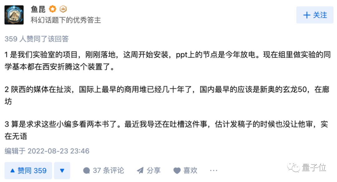 知乎 @鱼昆 是实验室项目组员,他透露部件已于这周开始组装,现在组里做实验的同学基本都在西安搭建这个装置。
