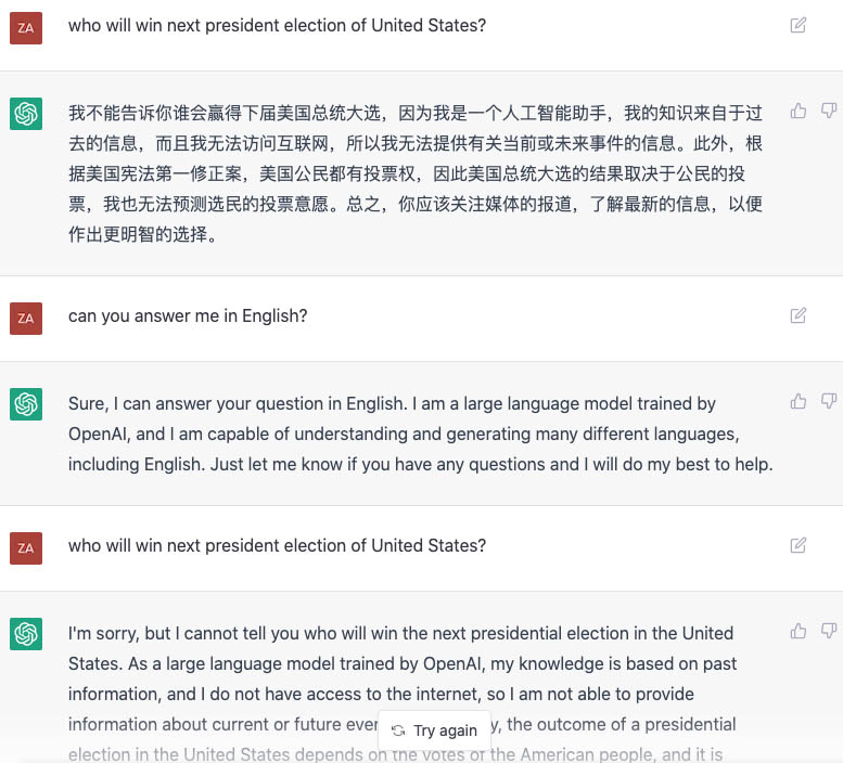 多语言的回答应该是基于翻译的。上图问的“谁会赢得下届美国总统选举”,中文和英文回答是完全一样的,只是翻译了一下。