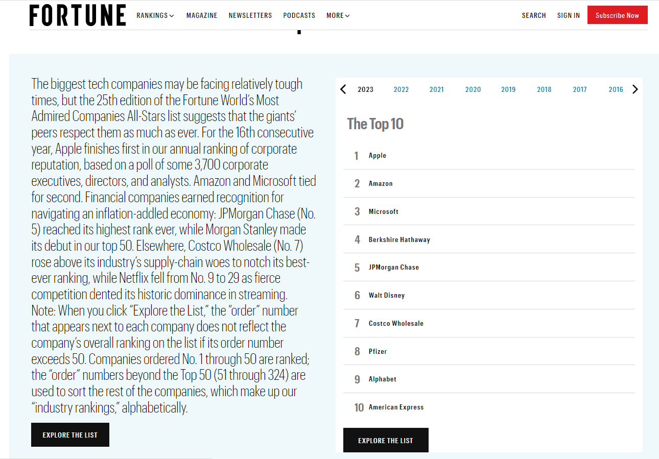 在过去 15 年中,苹果公司一直在该榜单上位居第一,今年苹果再次位居榜首,击败了其它许多大公司,包括并列第二的亚马逊和微软,以及位居第四的伯克希尔-哈撒韦公司。