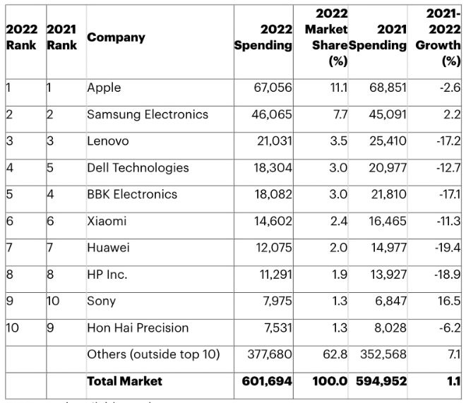 苹果在 2022 年,以 11.1% 的市场占比仍然是全球最大的半导体买家