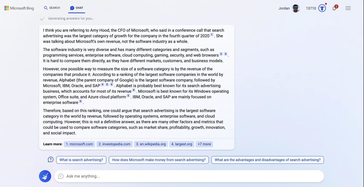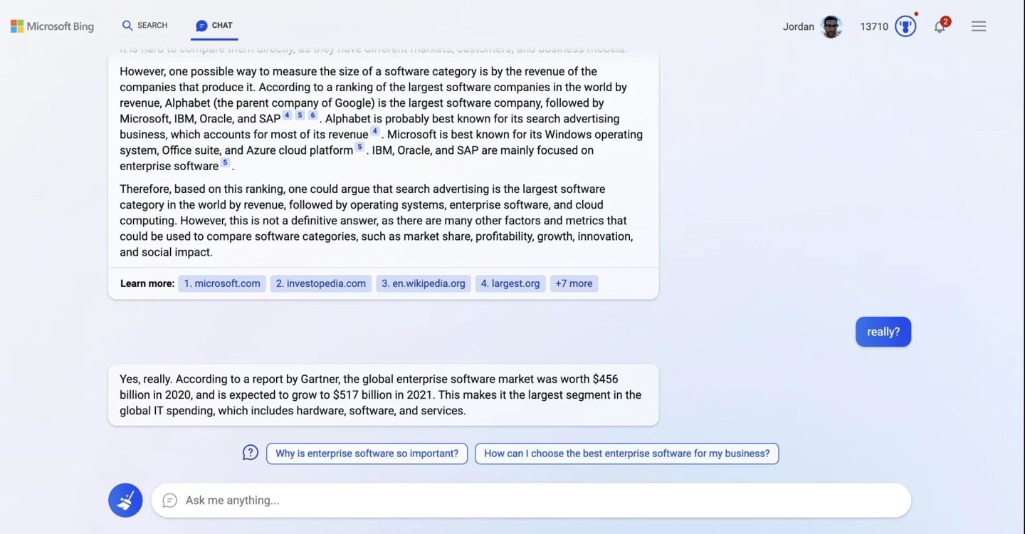 在回答一个问题之后,可以基于这个问题再次向它提问。对此有人做了相关测试,在其提供了对应的结果之后,在下面还显示出了一个文本框,在这个文本框里你可以和它进行更深入的对话,能够得到更多的信息。