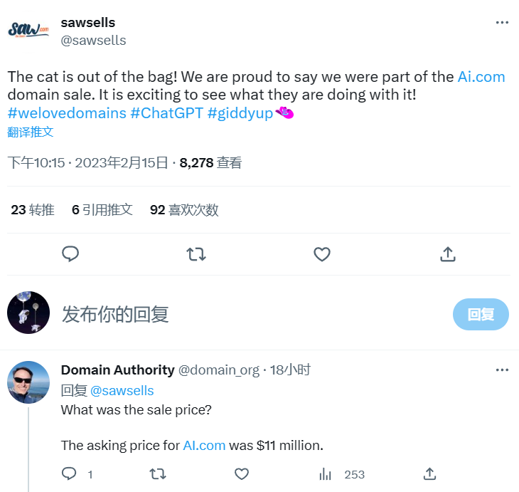 域名经纪巨头 Saw.com 于 2 月 15 日表示: