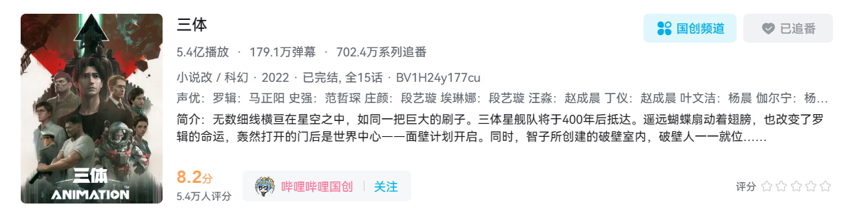 目前尚不清楚《三体?持剑》将何时开播。B站官网显示,《三体》动画累计播放量达 5.4 亿,评分 8.2。