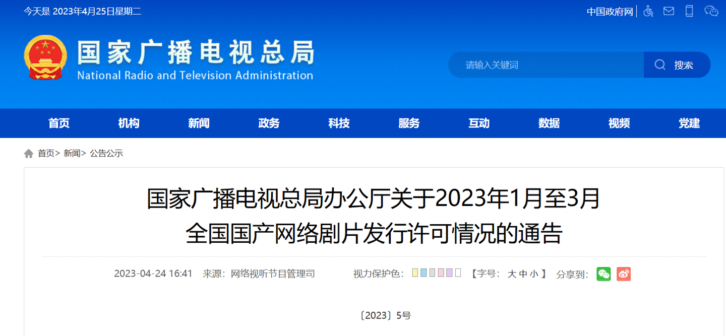 4 月 25 日消息,国家广播电视总局 4 月 24 日公布了 2023 年 1 月至 3 月全国国产网络剧片发行许可情况,颁发发行许可的国产网络剧片共 238 部。其中网络剧 38 部 1009 集,网络微短剧 83 部 1848 集,网络电影 57 部,网络动画片 60 部 649 集。