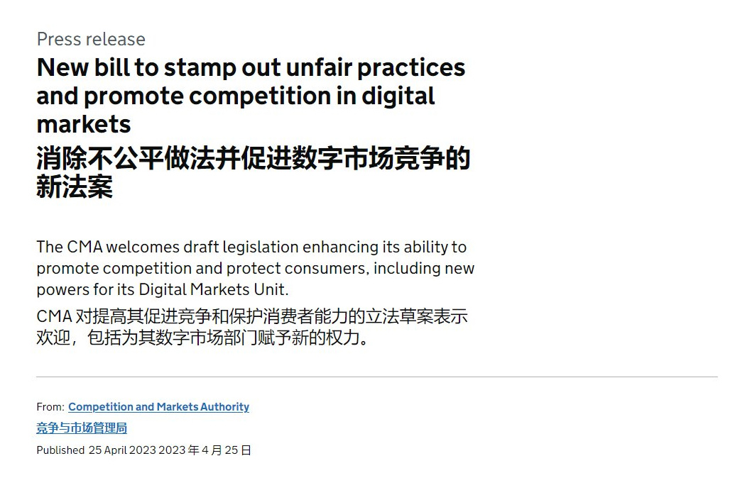 英国官方发布新闻稿,出台这项法案的目的,是赋予 CMA 更高的权限和处罚力度,解决科技公司“过度垄断”(excessive dominance)的问题,以进一步促进竞争和保护消费者。