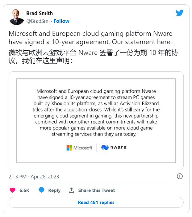 微软总裁布拉德?史密斯(Brad Smith)在推文中还强调,在完成收购动视暴雪之后,后者的相关游戏也会引入到 Nware 平台。