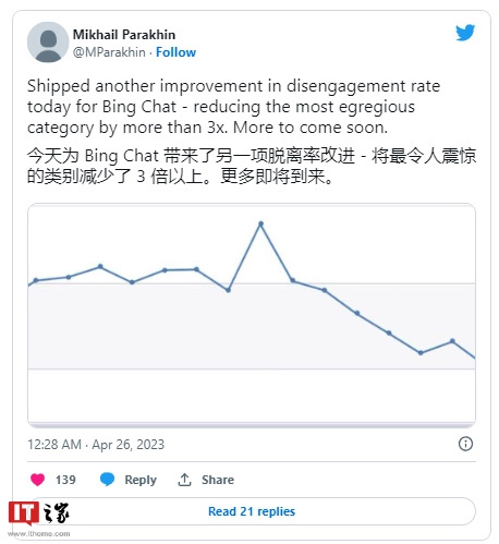 微软广告和网络服务部门的负责人 Mikhail Parakhin 在推特上表示,Bing Chat 团队“发布了一个降低中断率的改进”,他说这次更新将使“最严重的类别的中断率降低了三倍以上”。