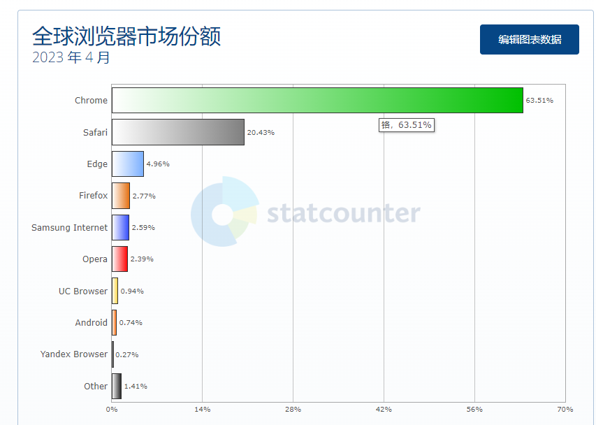 在所有平台,Chrome 在 4 月凭借 63.51% 的全球市场份额名列第一,相比上个月 64.76% 的市场份额下降 1.25%;Safari 以 20.43% 的份额位居第二,较上月 上升 0.91%;Edge 以 4.96% 的份额位居第三,较上月上升 0.32%;最后,Firefox 以 2.77% 的份额位居第四,较上月下降 0.16%。三星浏览器、Opera、UC 浏览器等浏览器瓜分了剩余市场份额。