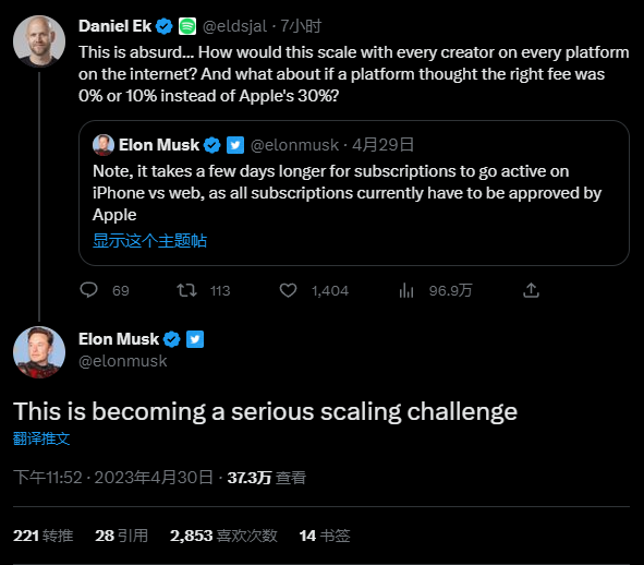 Spotify 首席执行官 Daniel Ek 随后在推特上转发了马斯克的帖子,并再次抨击了苹果的政策: