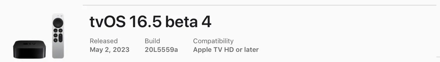5 月 3 日消息,苹果今天面向开发人员,发布了 tvOS 16.5 的第 4 个 Beta 版本更新(内部版本号为 20L5559a),距离上个版本相隔 1 周时间。
