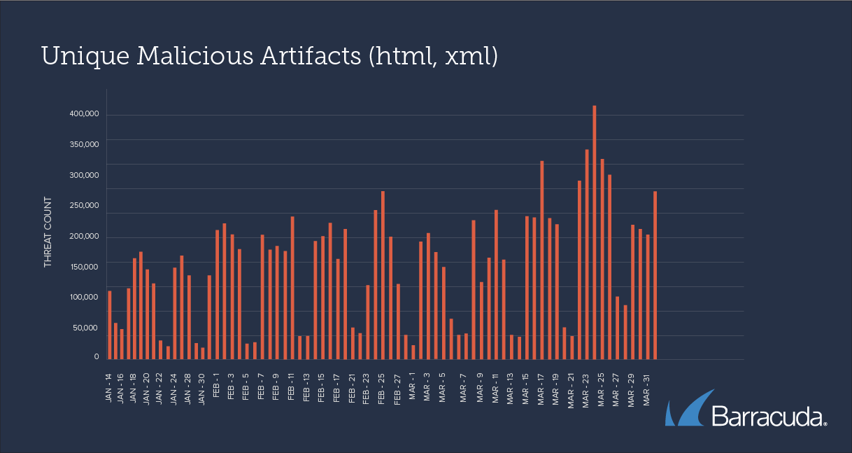 在 3 月 23 日,总共扫描检测到 475938 个恶意 HTML 附件,其中 405438 个存在不同,占比达到 85%。