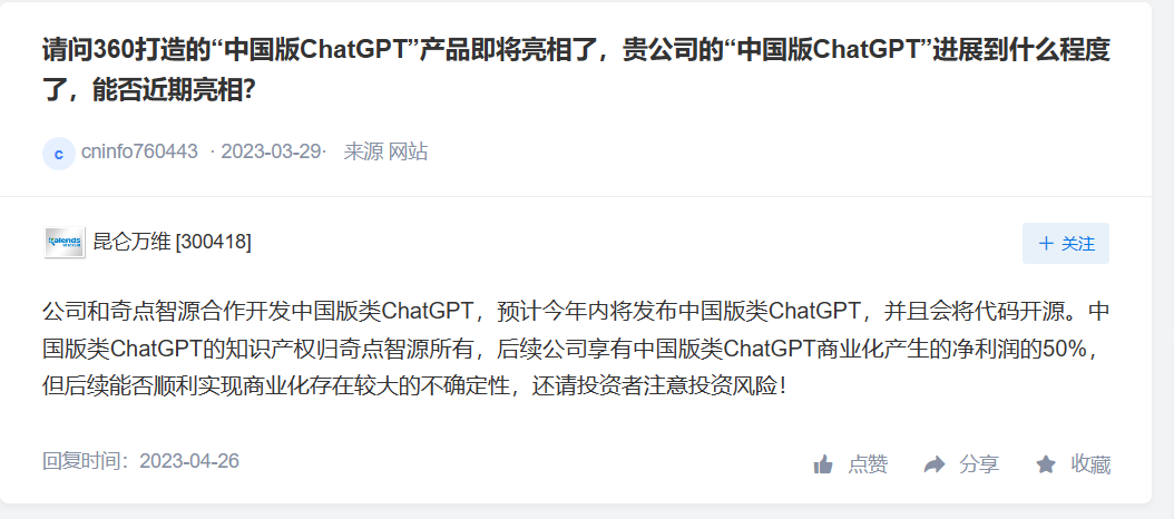 公司和奇点智源合作开发中国版类 ChatGPT,预计今年内将发布中国版类 ChatGPT,并且会将代码开源。中国版类 ChatGPT 的知识产权归奇点智源所有,后续公司享有中国版类 ChatGPT 商业化产生的净利润的 50%,但后续能否顺利实现商业化存在较大的不确定性,还请投资者注意投资风险!