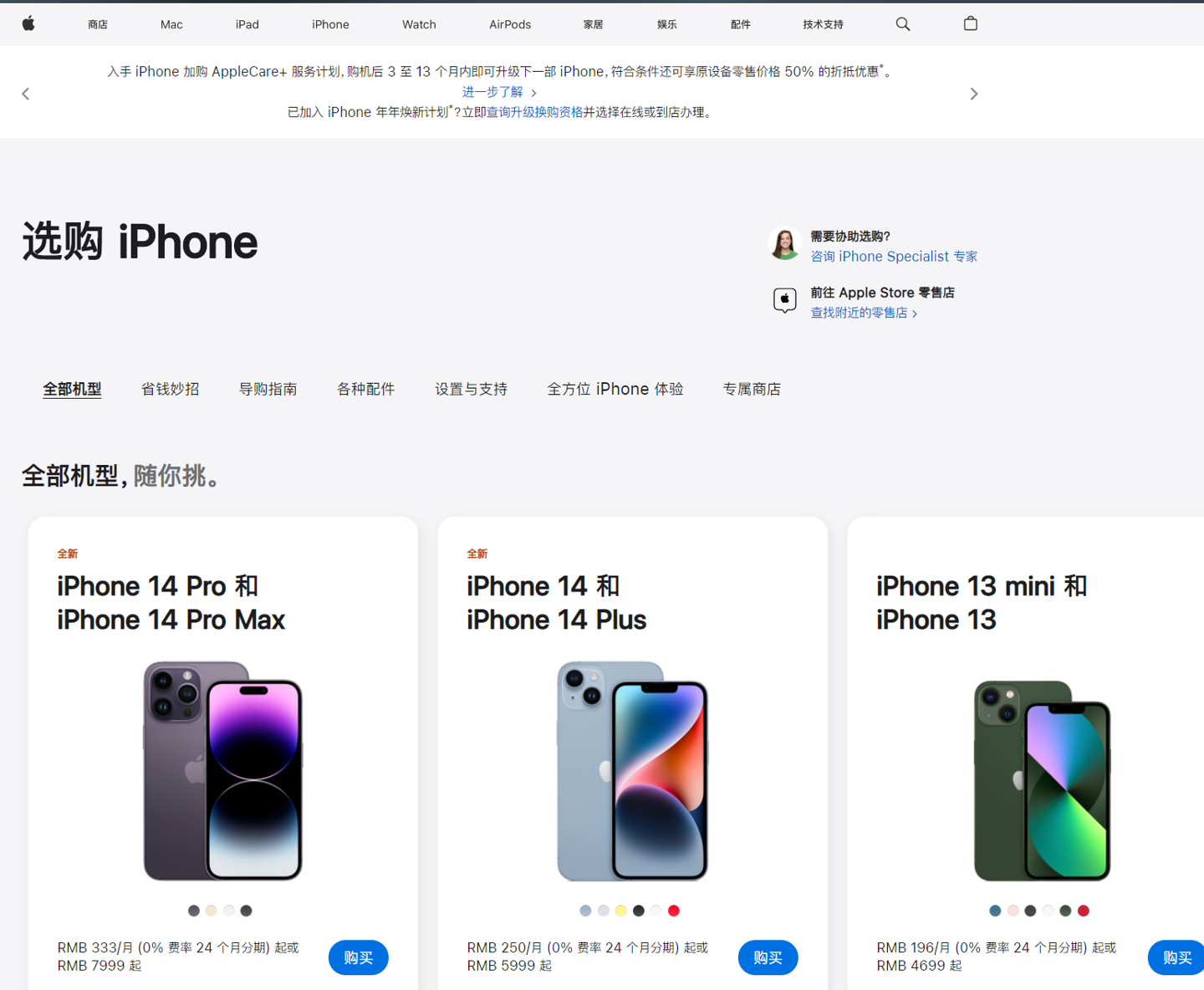 除了首页外,苹果 Apple Store 在线商店首页(https://www.apple.com.cn/store)访问正常,用户依然可以正常购买 iPhone 14 系列、Mac、iPad 等产品。