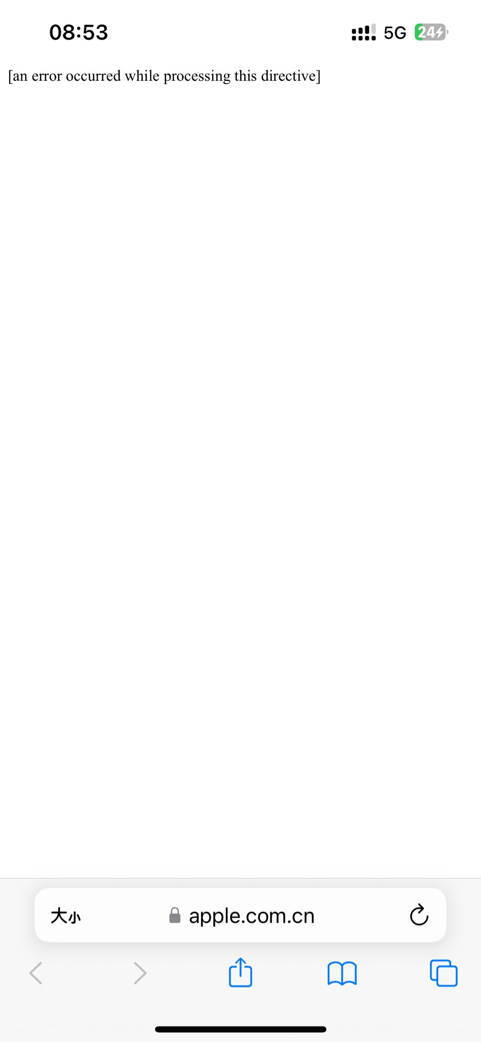 苹果中国官网(https://www.apple.com.cn/)首页出现崩溃问题,经IT之家查看,目前还未恢复正常,提示 [an error occurred while processing this directive](在执行此命令时出现错误)。