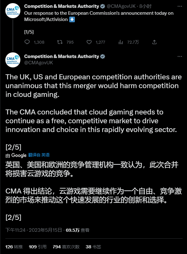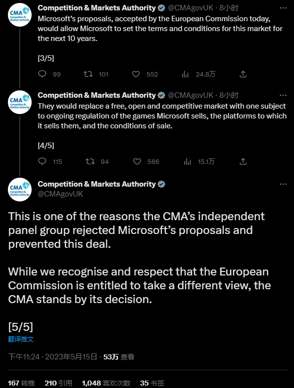 “英国、美国和欧洲的竞争当局一致认为,此次收购将损害云游戏领域的竞争。CMA 的结论是,云游戏需要继续作为一个自由、竞争的市场,以推动这个快速发展的行业的创新和选择。微软的提议今天被欧盟委员会接受,将允许微软在未来十年为这个市场设定条款和条件。