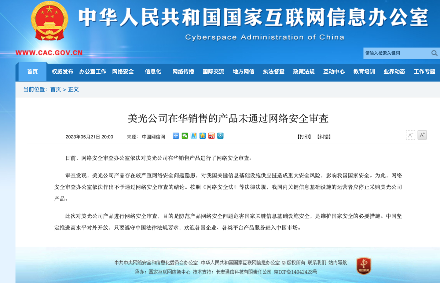5 月 21 日消息,网信办官网今日发布通知,称美光公司在华销售的产品未通过网络安全审查。