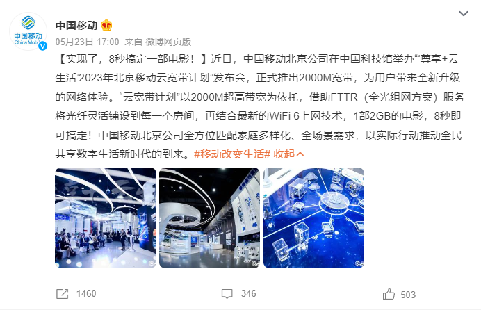 5 月 28 日消息,随着联通、电信步伐,中国移动也开始全面推广 2000M 宽带,目前北京等已经开始启动并且能安装使用,感兴趣的IT之家小伙伴可以关注一下。