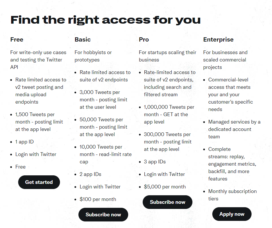 Twitter 表示,该 API 级套餐允许开发人员每月获取 100 万条推文和每月发布 30 万条推文,并使他们能够访问完整的存档搜索端点。此前,Twitter 宣布于 2 月 9 日起开始不再免费提供 API 接口,随后推出了三种不同的 API 服务,分别为免费、基础版和企业版。基础服务为每月收费 100 美元(当前约 707 元人民币),企业版服务每月为 42000 美元(当前约 29.7 万元人民币)。