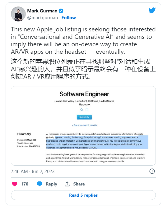 翻译古尔曼的推文内容如下:“苹果正招募新的软件工程师,要求熟悉‘对话和生成式 AI’开发的人员,并暗示会借助生成式 AI 的力量,加速为头显设备创建 AR / VR 应用程序”。