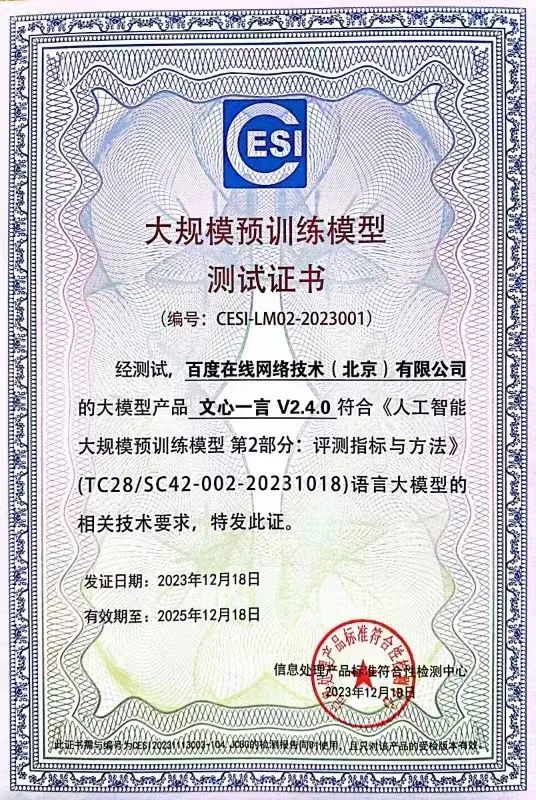 百度文心大模型首批通过大模型标准符合性测试