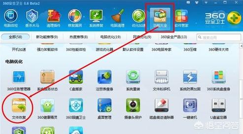 步骤四:然后打开360 安全卫士,进入功能大全,在此目录下找到文件恢复,然后打开。