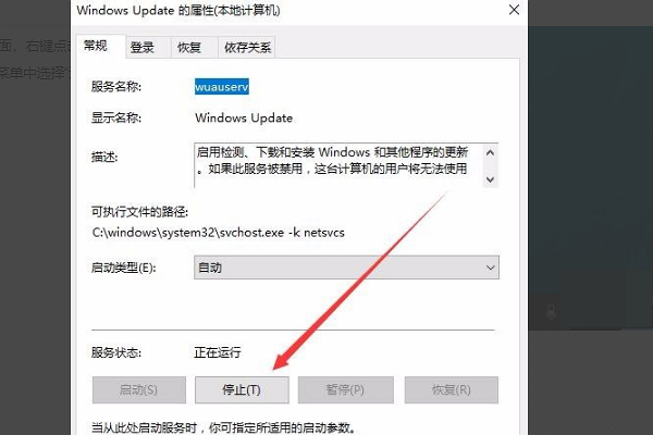 4、双击Windows Update一项后,在打开的属性窗口中,点击“停止”按钮,停止当前的Windows Update服务。