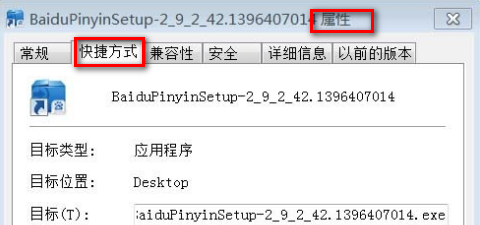 2、右键单击百度输入法快捷方式安装图标,点击属性,跳出如下图所示对话框。