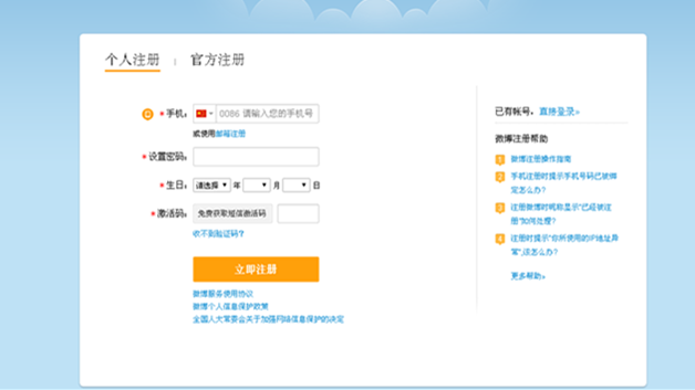 新浪微博的注册方式主要有两种。一是用手机号注册,输入手机号码,设置密码和生日之后,再点击免费获取短信激活码即可注册新浪微博。