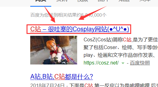 5、搜索后再从网页中找到【C站 – 很哇塞的Cosplay网站(●^U^●)】点击进入即可进入C站了;