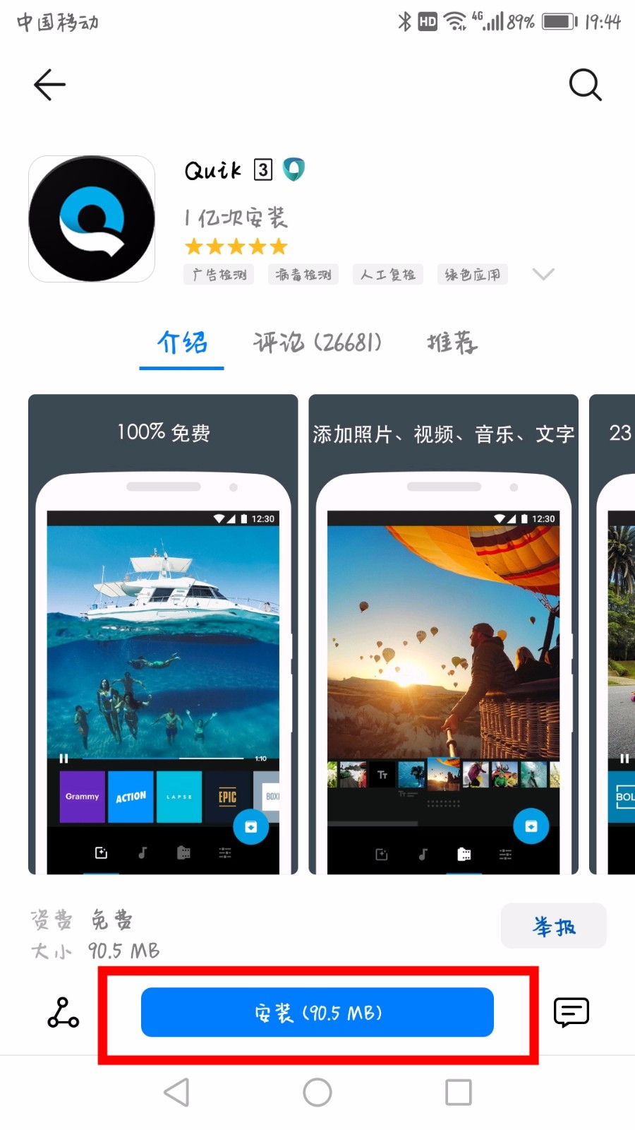 (2)卸载之后,打开华为的“应用市场”,搜索“Quik”并下载安装,安装完成后,快捷方式便会自动出现在桌面上。