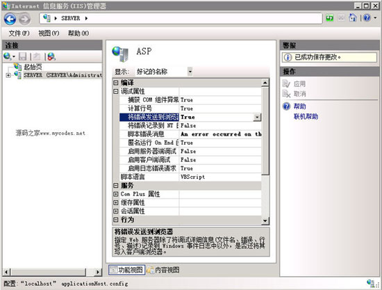 打开IIS7的asp设置,展开“调试属性”选项,“将错误发送到浏览器”这项默认的是False,改为True,然后点右侧的应用!如图所示: