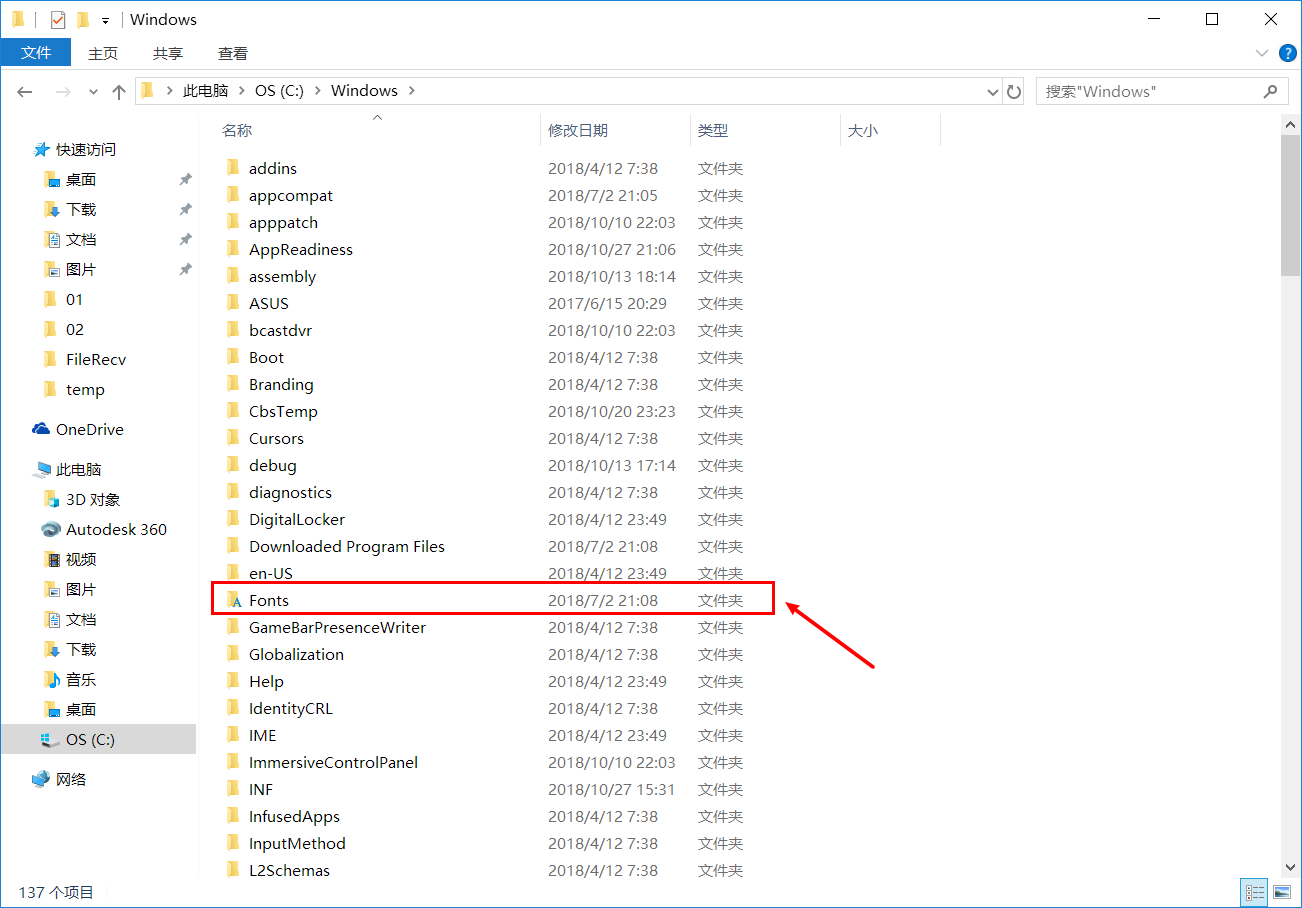 3、在”Windows“文件中,找到“Fints”文件夹,此文件夹中的内容就是此电脑的所有字体。