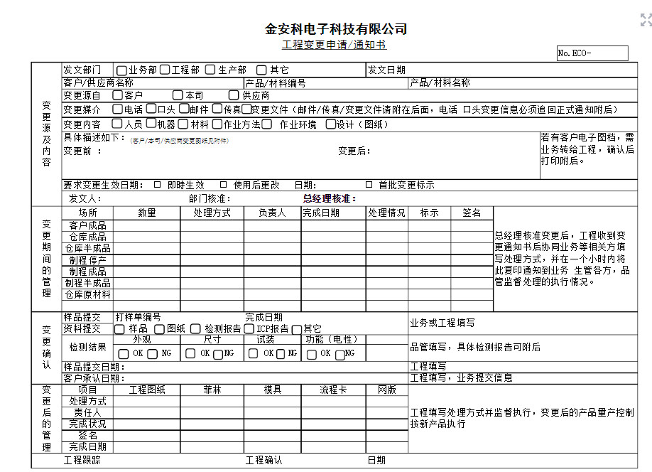 工厂中的任何受控资料需要变更时,以ECN形式提出.经相关单位会签批准后方可生效.即入文控中心存档。
