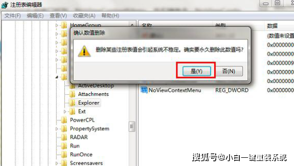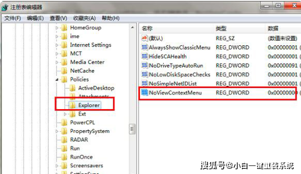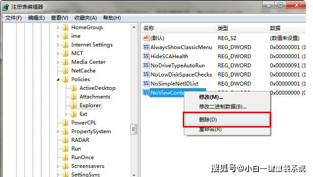 (4)在Explorer的右侧找到NoViewContextMenu,右键进行删除。