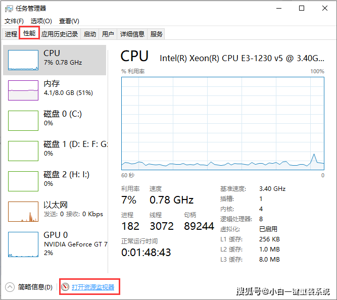 1,右键点击任务栏,选择“任务管理器”,将界面切换到“性能”,点击“打开资源监视器”进入。