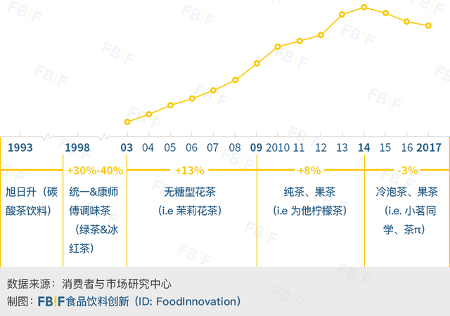 1993—1997年为即饮茶的市场导入期,1998年后,即饮茶市场开始快速增长,众多企业开始入局,品类创新的速度也在增长。但2009年开始,增速开始下滑至个位数,直到2014年以后,增速为负,市场进入成熟期。