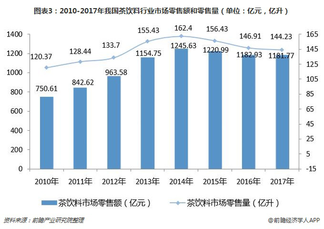 2014年以后,虽然即饮茶的零售价格在上涨,这主要体现在诞生了4-5元的新派茶饮,如农夫山泉的茶π和统一的小茗同学,但零售量下降得更快,因此零售额整体呈下降态势。