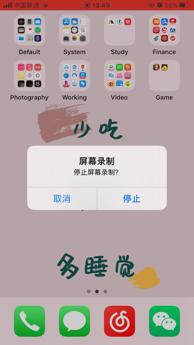 ⑤ 录制过程中iPhone上面会有红色的显示框,如果需要停止录制可以通过点击红色显示条的位置选择停止录制,或者通过控制中心来停止录制屏幕