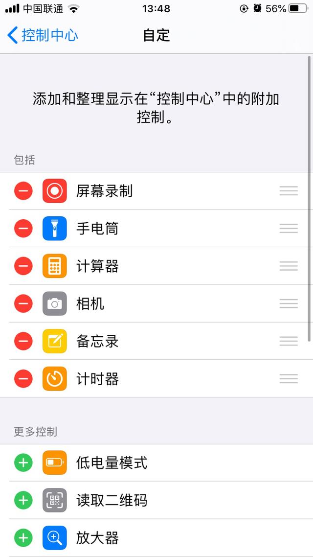 ② 确保自定控制包括【屏幕录制】,如果没有的话需要在更多控制中进行添加,点击图标左侧的绿色+号按钮即可完成添加,可以按照自己的喜好对已有控制进行排序
