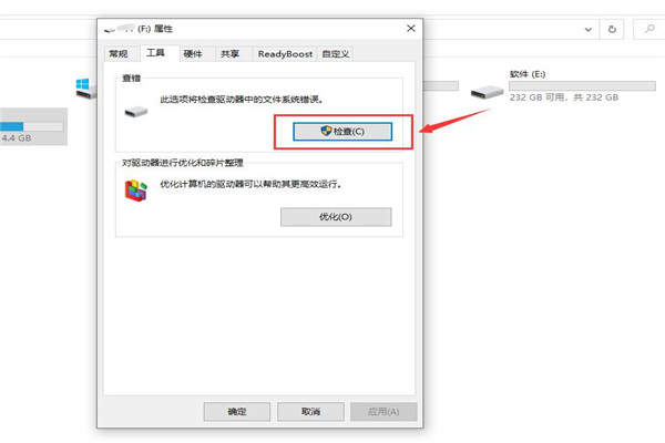 第三步:选择属性窗口中的【工具】,点击下方的【检查】按钮