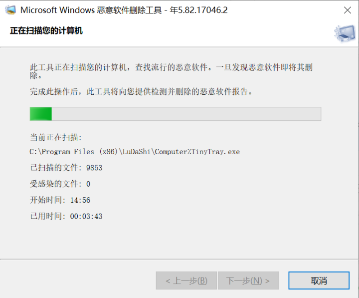 4、正在扫描您的计算机,此工具正在扫描您的计算机,查找流行的恶意软件。一旦发现恶意软件即将其删除。完成操作后,此工具将向您提供检测并删除的恶意软件报告,等待扫描完成即可;