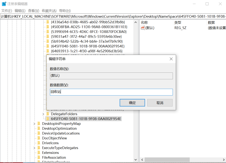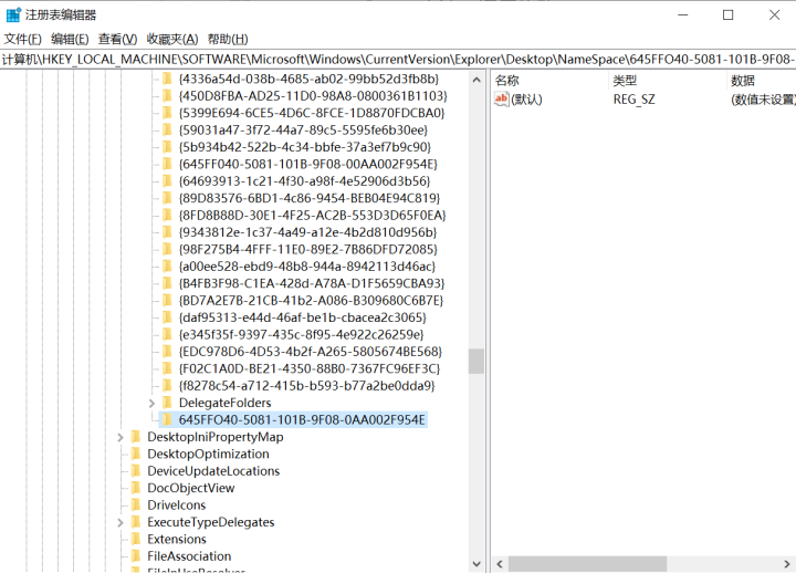 2、打 开 注 册 表 , 按 照 以 下 文 件 路 径 , 依 次 找 到 对 应 选 项“ HKEY_LOCAL_MACHINE\SOFTWARE\Microsoft\Windows\CurrentVersion\Exp lorer\Desktop\NameSpace”,并选中对应的“NameSpace”选项,右击选择新建”项“ 文件, 将项值命名为” {645FFO40 — — 5081 — — 101B — — 9F08 — — 00AA002F954E}“。