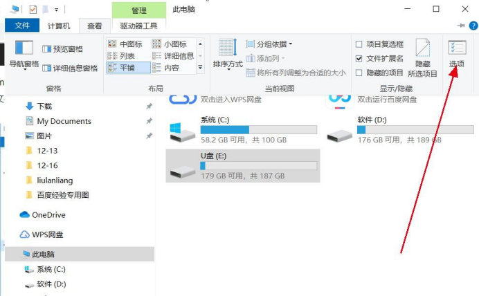 2、选中U盘设备,点击窗口上方的”查看“ -->”选项“ -->”更改文件夹和搜索选项”。