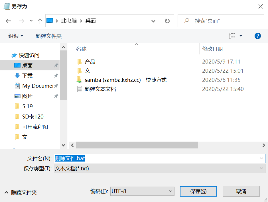 第二步:将文本文档另存为“删除文件.bat”,这里需要注意的是文件后缀一定要设置为“.bat”;
