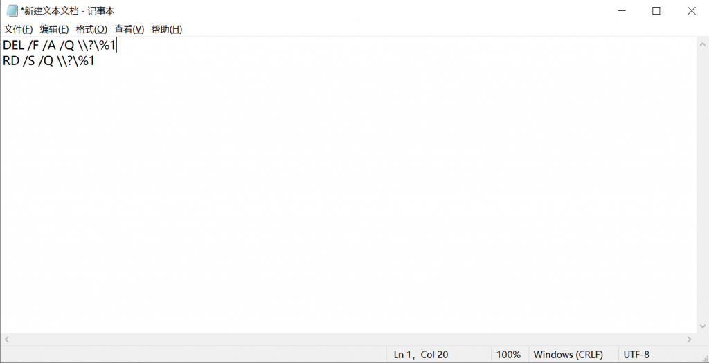 第一步:将U盘连接至电脑,右键桌面上新建文本文档,在文本文档中输入“DEL /F /A /Q \\?\%1 RD /S /Q \\?\%1”;