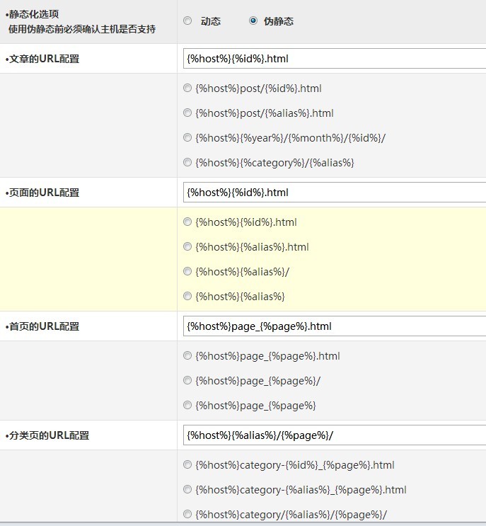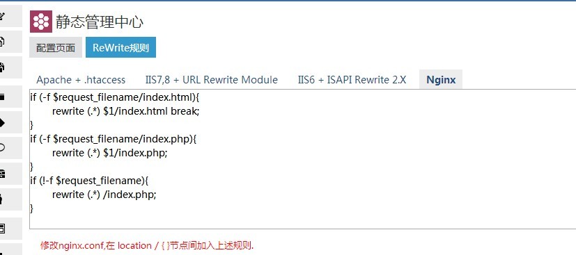 根据你网站的空间环境配置,选择不同的标签获取伪静态文件代码,制作伪静态文件上传到网站根目录。