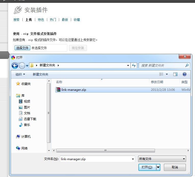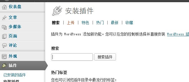 选择文件上传,现在安装启用插件就行了,然后刷新网站后台,看看左边工具栏的链接是不是比以前多了一个。