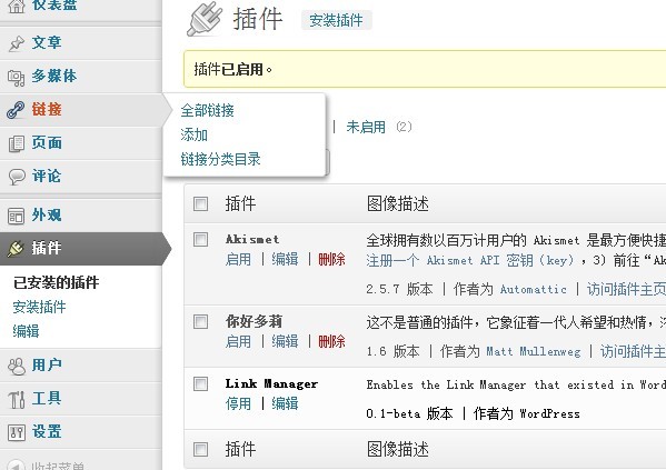 有一天,在看一篇网站文章的时候,发现一个测试版的插件很好用。可以帮助wordpress程序实现链接分类目录的功能,让友情链接在网站前台调出。这里是下载地址:http://www.seo.net.cn/upload/link-manager.zip,供新站长下载使用。使用方法也很简单。你只需要在网站后台找到插件就可以了。