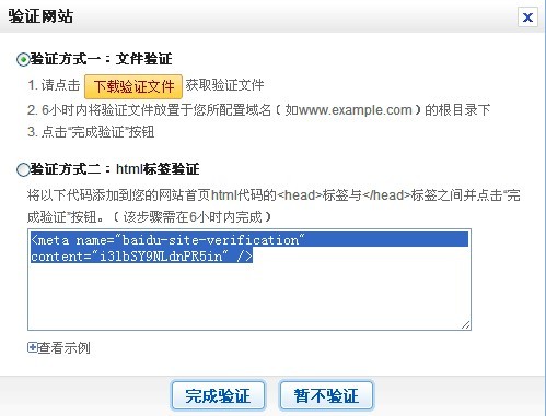 很明显,添加一个网站,输入你的网站域名。在这里,一个百度账号只能对应一个网站。如果需要在多个网站使用,需要注册多个账号。点击添加网站,输入域名后,会弹出验证窗口。有两种验证方法。个人认为第一种验证方式比较简单。下载验证文件,通过FTP工具上传到网站根目录,然后点击完成验证。第二种方法是复制下面的代码,适合有一定代码基础的人。通过FTP下载网站首页文件,将复制的代码添加到网站首页文件的head…… /head标签中。保存后,上传并点击完成验证。