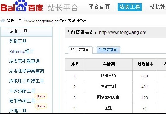 以前只能用第三方站长工具,查出来的信息不一定准确。现在百度官方推出的站长工具在那些站长工具的基础上更进一步,会对我们了解自己网站的真实情况有很大的帮助,进而以最好的方式优化自己的网站,而不是一味的做SEO。百度的站长工具现在对所有网站开放,前段时间测试的,现在已经全面开放。今天百度还开通了搜索关键词查询工具,功能更强大。